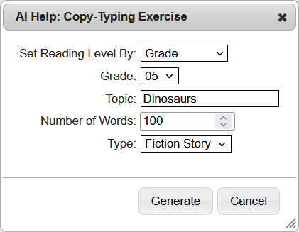 Get help from the AI. Use the AI to create your own exericses. Just provide a few options, such as a reading level and topic, and get an original story, nonfiction essay, or writing prompt in seconds.